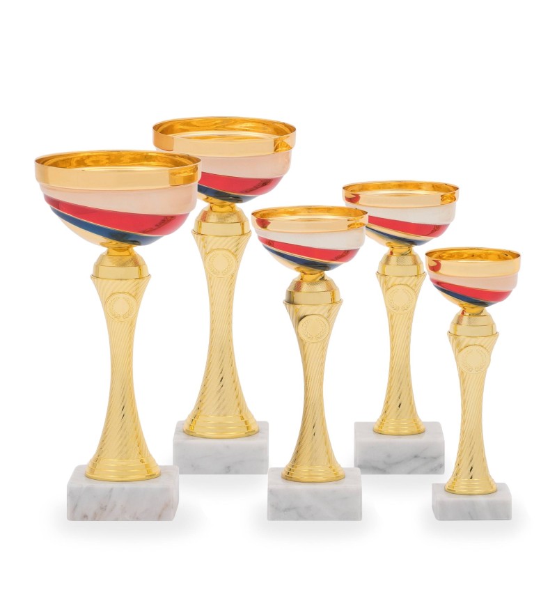 Zlaté sportovní poháry s barevným zdobením kalichu - v trikolóře bílá, modrá a červená. Dostupný v pěti různých velikostech. Požadovanou velikost vyberte v možnostech.