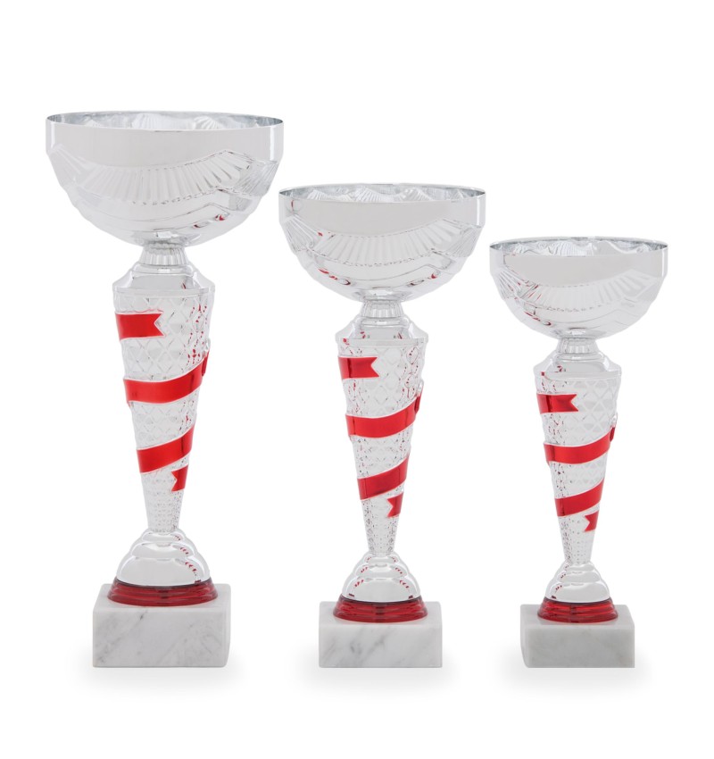 Stříbrné, sportovní zdobené poháry s červeným zdobením. Dostupné ve třech různých velikostech. Vyberte si velikost v možnostech.