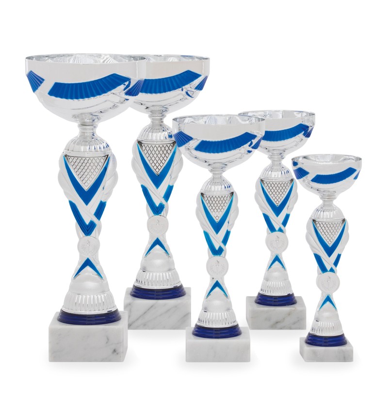 Stříbrné, slavnostní zdobené poháry s modrým zdobením. Dostupný v pěti různých velikostech. Vyberte si velikost v možnostech.