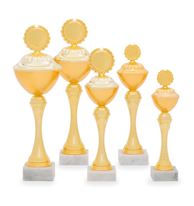 Zlaté sportovní zdobené poháry se zlatými poklicemi.