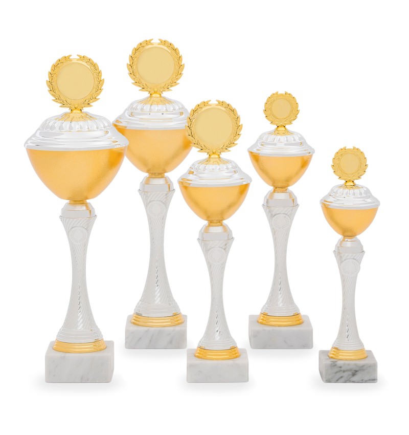 Zlato-stříbrné sportovní zdobené poháry s poklicemi.