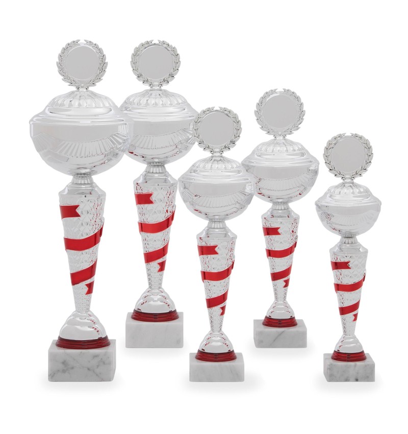Stříbrné, sportovní zdobené poháry s červeným zdobením včetně poklice. Dostupné v pěti různých velikostech. Vyberte si velikost v možnostech.