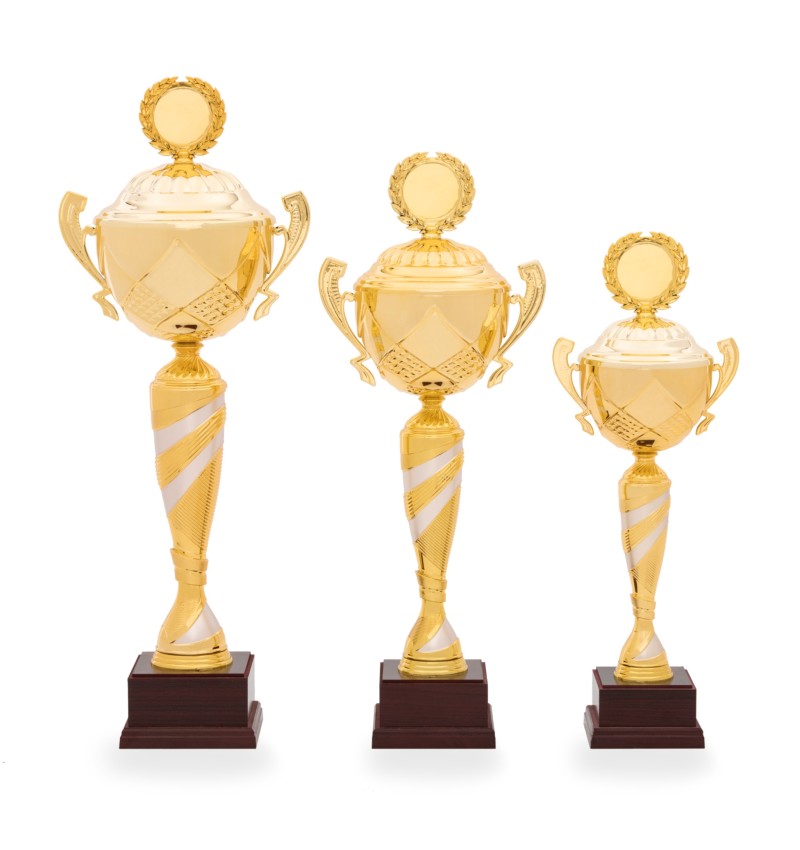 Slavnostní, zlaté sportovní poháry s dřevěným podstavcem. Dřevěný podstavec vytváří dokonalý vzhled celkového poháru. Tento pohár je včetně zlaté poklice na kterou lze vložit také emblém. Požadovanou velikost poháru si vyberte v možnostech.