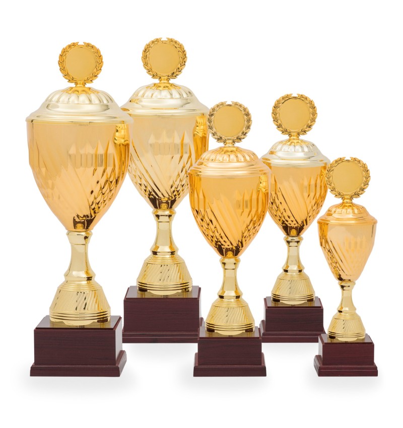 Slavnostní, zlaté sportovní poháry s dřevěným podstavcem. Dřevěný podstavec vytváří dokonalý vzhled celkového poháru. Tento pohár je včetně zlaté poklice na kterou lze vložit také emblém. Požadovanou velikost poháru si vyberte v možnostech.