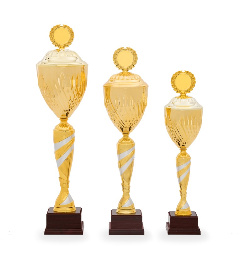 Slavnostní, zlaté sportovní poháry s dřevěným podstavcem. Dřevěný podstavec vytváří dokonalý vzhled celkového poháru. Tento pohár je včetně zlaté poklice na kterou lze vložit také emblém. Požadovanou velikost poháru si vyberte v možnostech.