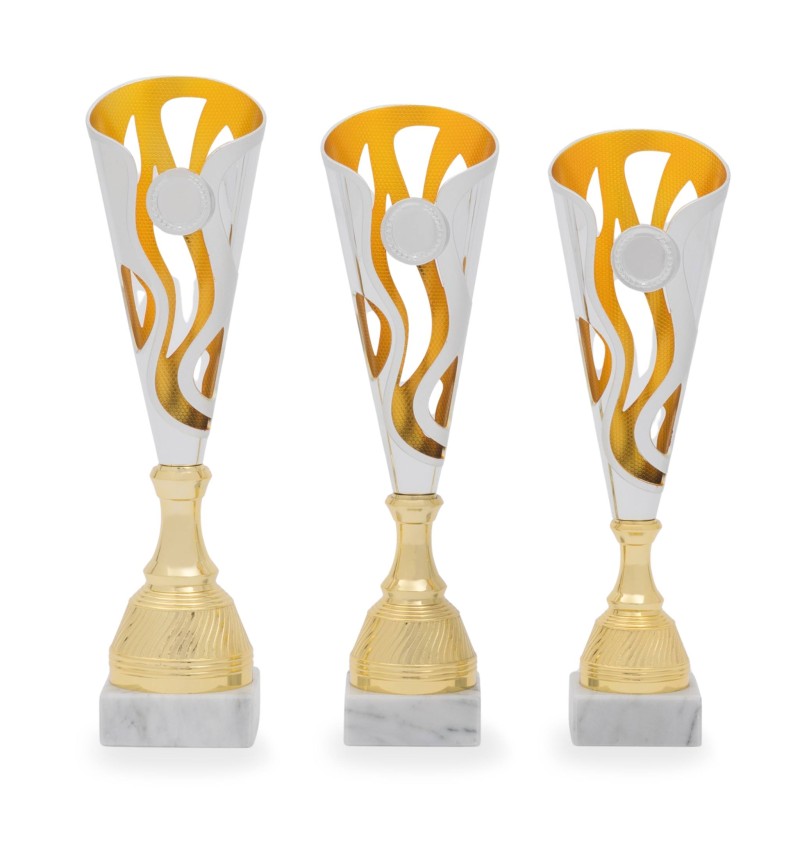 Celoplastový pohár se zlato - stříbrným detailem. Pohár je na mramorovém podstavci. K poháru lze vložit emblém.