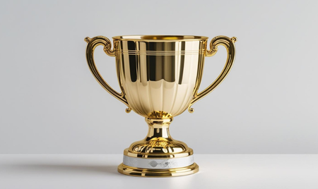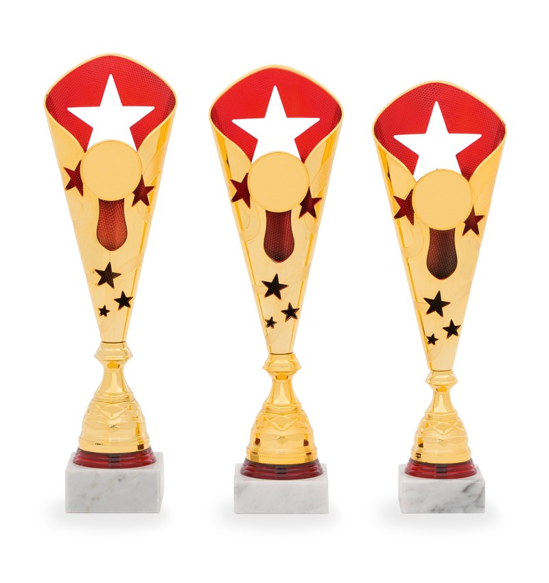 Celoplastový zlatý pohár s červeným vnitřním detailem s hvězdičkami. Pohár je na mramorovém podstavci. K poháru lze vložit emblém.