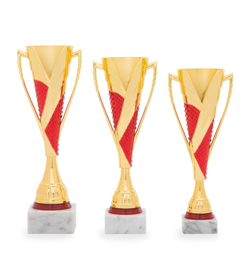 Celoplastový zlatý pohár se červeným detailním zdobením. Pohár je na mramorovém podstavci.