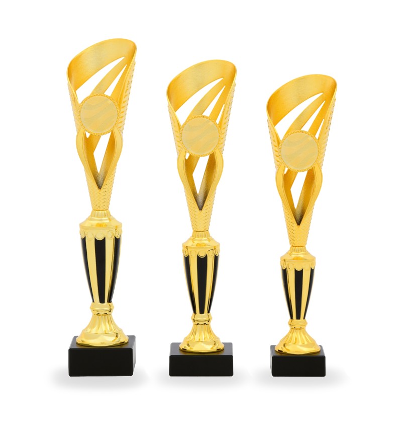 Celoplastový zlatý pohár s černým detailním zdobením. Pohár je na mramorovém podstavci. K poháru lze vložit emblém.