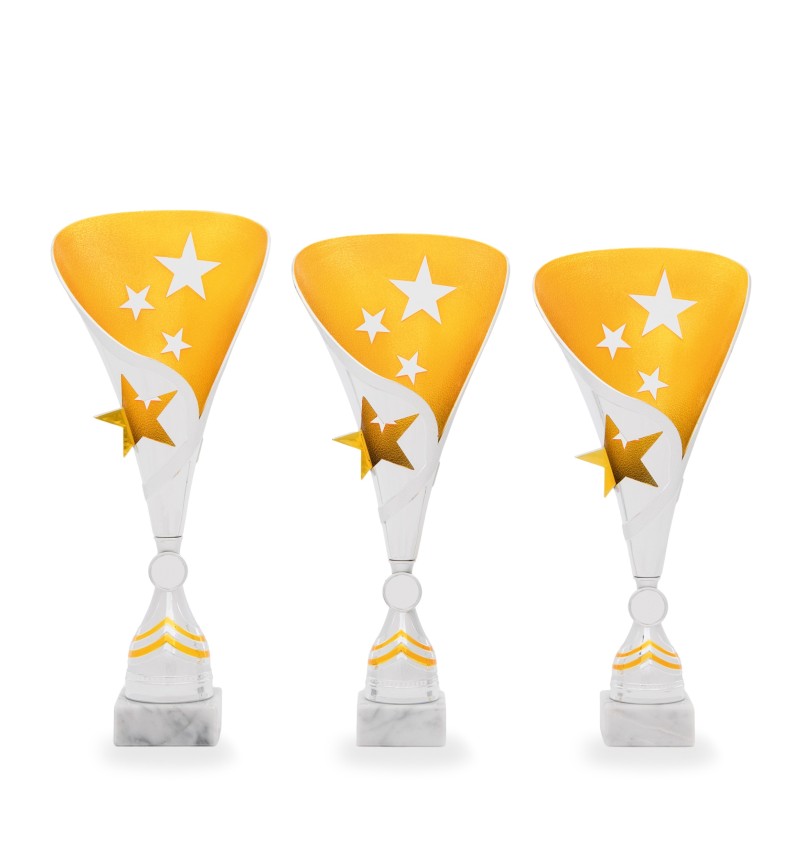 Celoplastový stříbrný pohár se zlatým vnitřním detailem s hvězdičkami na mramorovém podstavci. K poháru lze vložit emblém. Pohár je dostupný ve třech různých velikostech. Požadovanou velikost si vyberte v možnostech.